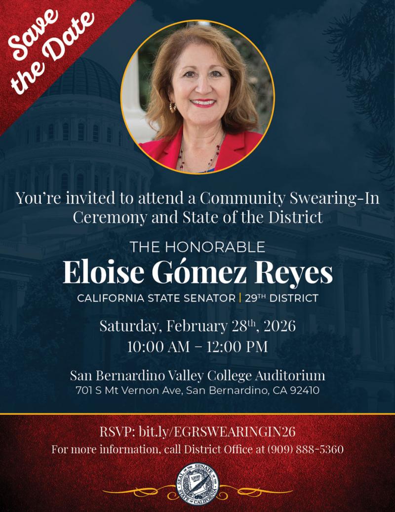 You're invited to attend a Community Swearing-In Ceremony and State of the District for Senator Reyes, on Saturday, Feb. 28, 2026 from 10 am - noon.